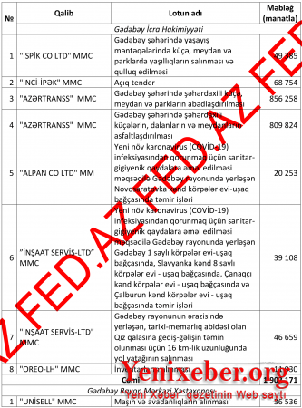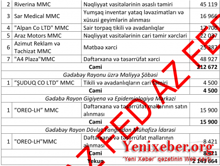 Yenixeber.org: Məlumata görə, İcra hakimiyyəti 8 tenderə 1 milyon 902 min 171 manat xərcləyib. Gədəbəy Rayon İcra Hakimiyyətinin keçirdiyi ən böyük tenderi "AZƏRTRANSS" MMC udub.