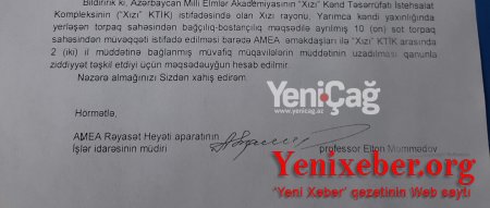 Yenixeber.org: Milli Elmlər Akademiyasının (AMEA) prezidenti, akademik Ramiz Mehdiyev qurumun 500-dən çox əməkdaşına verilmiş “Xızı” Kənd Təsərrüfatı İstehsalat Kompleksinin istifadəsində olan Xızı rayonu, Yarımca kəndi yaxınlığında yerləşən bağ sahələrinin əllərindən alınması ilə bağlı göstəriş verib.