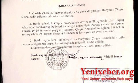 “Bu sənəd dağıdılaraq hərraca çıxarılmış Bərdə 20 Yanvar şəhidlərinin xatirəsinə ucaldılmış abidə-kompleksin mənimsənilməsinə dair rəsmi sübutdur.