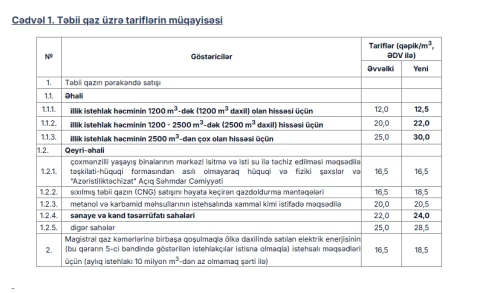 1200 kub metr olan hissə üçün 1 kub metr təbii qazın tarifi 0,5 qəpik (yarım qəpik, 4,2%) artırılaraq 12 qəpikdən 12,5 qəpik həddində;