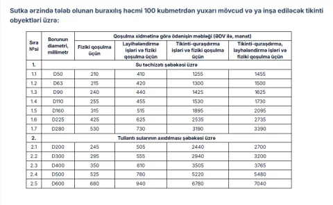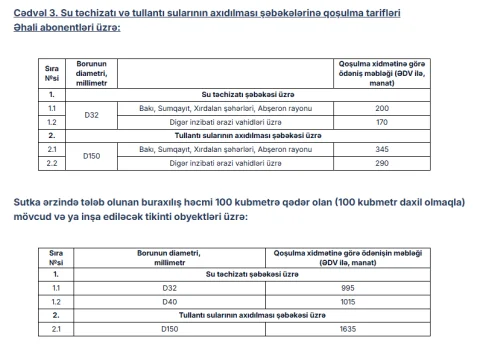Sutka ərzində tələb olunan buraxılış həcmi 100 kubmetrə qədər olan tikinti obyektləri üçün su təchizatı şəbəkəsinə qoşulmanın birdəfəlik tarifi borunun diametrinden asılı olaraq 995 manat və ya 1015 manat, tullantı sularının axıdılması şəbəkəsinə qoşulmaya görə 1635 manat məbləğində müəyyən edilib.
