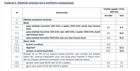 200 kVts olan hissə üçün 1 kilovatt saat elektrik enerjisinin tarifi 0,4 qəpik (5%) artırılaraq 8 qəpikdən 8,4 qəpiyə;
