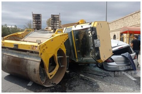 Gəncədə asfalt çəkən texnika maşının üzərinə aşdı