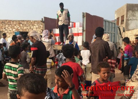 BƏƏ-nin Qırmızı Aypara cəmiyyətinin işçiləri Yəmənin Sokotra adasında yardım paylayırlar