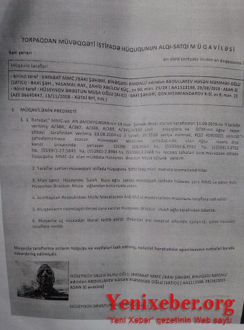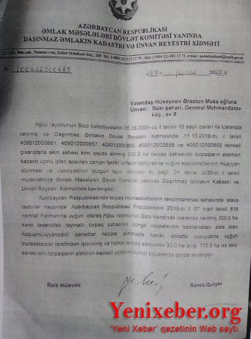 Digər tərəfdən, 200 hektar örüş təyinatlı sahənin 170 hektarına Daşınmaz Əmlakın Dövlət Reyster Xidməti 11.10.2019-cu il tarixdə "əkin sahəsi" kimi çıxarış verib(hərçənd yerdə qalan 30 hektar örüş sahəsi də Ərəstun Hüseynov tərəfindən əkilib). Daşınmaz Əmlakın Kadastrı və Ünvan Reysteri Xidməti isə həmin ərazilərə elektron koordinatlar müəyyənləşdirib. Qeyd edək ki, sözügedən çıxarışları və alqı-satqı müqaviləsini Bakı şəhərində yerləşən 23 saylı notariat kontorunun xüsusi notariusu Dəmirov Zaur Nizami oğlu təsdiq edib, yəni Ağsu rayonunun Bico kəndinin örüş sahələrinin alqı-satqısı Ağsudan kənarda aparılır və bütün bunlardan kənd bələdiyyəsinin xəbəri "yoxdu", olsaydı torpağın əsas sahibi kimi bələdiyyənin də sənədlərdə imzası, heç olmasa bu özbaşınalığa etirazı olardı. Yaxud, kənd bələdiyyə rəhbərliyi bu qanunsuzluqda maraqlı tərəflərdən biridir. Vurğulayaq ki, saxtalıqla da olsa, 170 hektarı əkin, 30 hektarı örüş sahəsi kimi göstərilən 200 ha əraziyə tam olaraq hər il subsidiya yazılır.