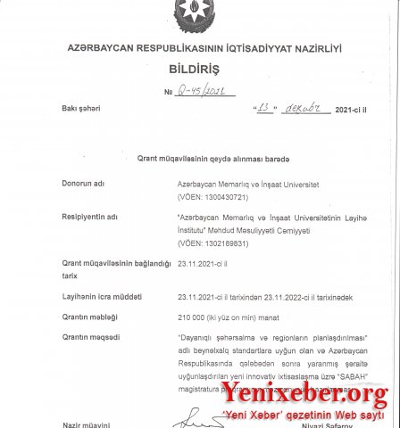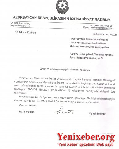 Həmin layihəni həyata keçirmək üçün Azərbaycan Memarlıq və İnşaat Universiteti “Layihə İnstitutu” MMC ilə müqavilə bağlayıb. Müqavilənin bağlanması və İqtisadiyyat Nazirliyində qeydə alınması qanun çərçivəsində həyata keçirilib. Sözügedən qrant müqaviləsinin İqtisadiyyat Nazirliyi tərəfindən qeydə alınması barədə bildirişlərin surətini məktubun sonunda Sizə təqdim edirik: