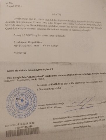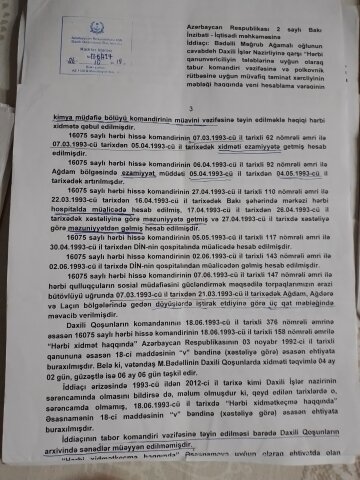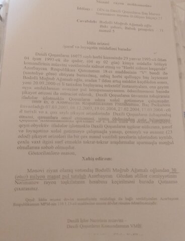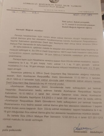 Sayğılı nazirimin  diqqətinə pensiya, təminatımın qərəzlə düz hesablanmadığını, məhkəməyə, prezidentə müraciətimə görə DQBİ-nin (özünün!) 1-ci dərəcəli Qarabağ əlilindən 30 milyon tələb etməsi, MPİ-nin 1978-ci ildən leytenant rütbəsi daşıyan zabitin, tabur komandirinin 1991-ci ildən Azərbaycan SQ-də “zabit rütbəsində xidməti barədə DQ-də məlumat olmaması” haqqında absurd iddialarını çatdırıram. Mənə nəinki zabit , komandir kimi, heç sıradan döyüşçü təminatına uyğun pensiya da qərəzlə verilmir. Təsəvvür edin, 390 manat vəzifə maaşı yazılıb, bu səbəbdən pensiyam tabeliyimdə olanlardan 3-4 dəfə azdır; nə işdənçıxarma, nə geyim-əşya, nə sığorta, nə məzuniyyət, ezamiyyət pulu verilib, nə xidmətim düz hesablanıb, nə mənzil və digər güzəştlər tətbiq edilir . Qərəz o həddədir ki, savaşda iştirakımı “xidməti ezamiyyət”, zədələnib hospitalda müalicəmi “məzuniyyət” kimi qələmə verirlər.
