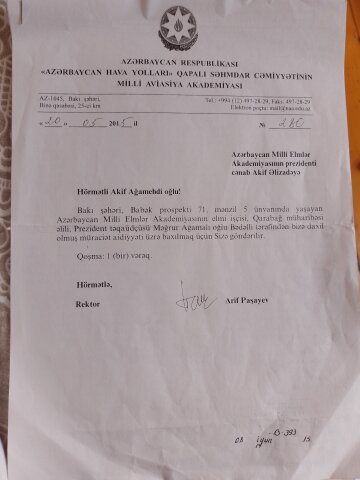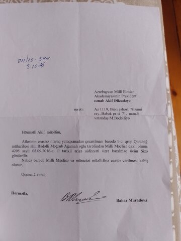 2015-ci ilin sentyabrın 25-də Akif Əlizadənin sədrliyi ilə AMEA Rəyasət Heyətinin 1-ci dərəcəli AMEA üzrə yeganə Qarabağ qazisinin mənzillə təminatı ilə bağlı iclası keçirilib. AMEA Prezidenti İşlər İdarəsinin rəhbərliyinə üzünü tutub, Qarabağda döyüşlərdə olan şəxsin əmlakından-yataqxana otağından məhrum edilməsinin düzgün addım olmadığını deyib və 2 ilə hazır olacaq Şərifzadə küçəsindəki evdən ikiotaqlı mənzil ayrılacağını SÖZ verib. Amma 2 ildən sonra bölgü olanda İşlər İdarəsi prezidentə sözünü unutdurub, mənzillər elə Akademiyanın prezidentinə, vitse-prezidentlərinə, akademik heyətinə, işlər idarəsinin gözü doymayanlarına, katibələrinə, sürücülərinə, bir sözlə haqq etməyənlərə verilib.