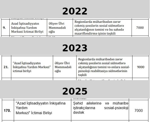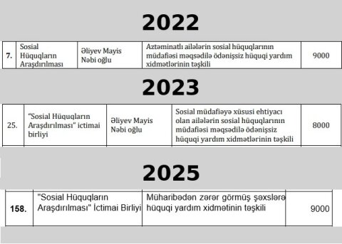 Maraqlıdır ki, Mayis Əliyev və qardaşı oğlu Ülvi Əliyev necə olub ki, QHT-lərə Dövlət Dəstəyi Agentliyindən təkrar layihələri bir kənara, üstəlik eyni məzmunlu layihələrinə Sosial Xidmətlər Agentliyindən də iri həcmli sosial sifarişlər ala bilib?