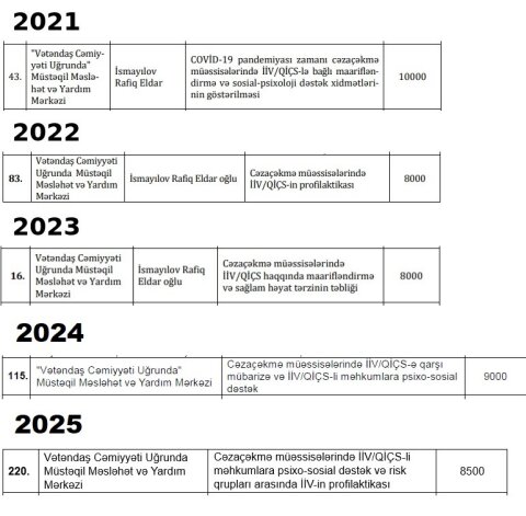Lakin sual doğuran əsas məqam budur: bu təşkilat QHT- lərə Dövlət Dəstəyi Agentliyindən hər il eyni layihə – cəzaçəkmə müəssisələrində İİV/QİÇS-ə qarşı mübarizə layihəsi üçün qrant alır. Beş il ardıcıl olaraq eyni mövzuya, eyni formada maliyyə ayrılması hansı meyarla əsaslandırılır?