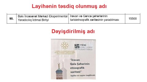 Bu qənaətə gəlməyimizə səbəb olan faktlardan biri də 2025-ci ilin qrant qalibləri sırasında yer alan Bakı İncəsənət Mərkəzi Eksperimental Yaradıcılıq Birliyi ilə bağlıdır. QHT-lərə Dövlət Dəstəyi Agentliyinin rəsmi elan etdiyi nəticələrdə bu təşkilatın qalib olduğu layihənin adı açıq-aydın göstərilib: “İrəvan və Gəncə şəhərlərinin tarixi etnoqrafik xəritəsinin yaradılması”. Yəni iki şəhəri əhatə edən, miqyaslı və iddialı bir layihə. Bu layihəyə görə də 15 500 manat dövlət vəsaiti ayrılıb.