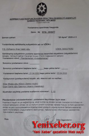 "Etdiyimiz müraciətimizə müsbət nəticəsi olmadığından, Sizə müraciət etməklə, bəzi məmurların dövlətimizin adına yaraşmayan əməllərini ictiamiləşdirmək məcburiyyətindəyik. Belə ki, bir neçə vaxtdır İsmayıllı “Yaşıl Market” bazar kompleksinin sahibi və Azərbaycan Qida Təhlükəsizliyi Agentliyinin Şamaxı Regional Bölməsinin rəisi İrfan İsgəndərovun cəzasızlıq, məsuliyyətsizlik, vəzifə borclarını yarıtmaz yerinə yetirmələri, rüşvət və korrupsiya mühitinin olması, sahibkarlıq subyektinin normal fəaliyyət göstərlməsinə qəsdən müxtəlif əngəllərin törədilməsi, ət kəsim sexində antisanitariya qaydalarına riayət olunmaması və s. özbaşınalıqlarla bağlı Prezidentə,1-ci Vitse Prezidentə, Kənd Təssərrüfatı Nazirliyinə, Qida Təhlükəsizliyi Agentliyinə, Baş Prokurorluğa və İsmayıll Rayon İcra Hakimiyyətinə müraciət olunmuşdur. Təəssüflər olsun ki, etdiyimiz haqlı müraciətimizə bu günədək cavab verilməmiş, biganə və laqeyid münasibət göstərilmişdir. Bütün dünya koronavurusla mübarizə aparır. Lakin Azərbaycan Qida Təhlükəsizliyi Agentliyinin Şamaxı Regional Bölməsinin rəisi İrfan İsgəndərov isə karantin vəziyyətini fürsət bilib yazdığımız yazılara görə bizi susdurmaq istəyir. Açıq-aşkar qanunsuz hərəkətlər edir. Belə ki, 21 aprel 2020-ci il tarixdə bizə məxsus İsmayıllı şəhəri Cavanşir küçəsində yerləşən obyektdə yoxlama aparmaqla güya, fəaliyyətdə olan ət satışı mağazasında sanitariya-gigiyena qaydalarına əməl olunmadığını əsas gətirərək, fəaliyyət göstərdiyimiz