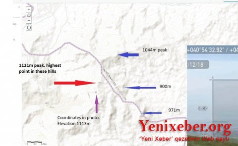 Qaldı yüksəklik. Növbəti –ikinci topoqrafik xəritəni siz hətta internetdə də tapa bilərsiniz. Orada həmin zonadakı bütün yüksəkliklər var. Aydın görsənir ki, sərhədin deyilən hissəsində Azərbaycan tərəfdə belə yüksəklik yoxdur: 1100 metrdən hündür bütün dağlar Ermənistan ərazisindədir. Şəkil isə, xatırladırıq, 1113 metrdən çəkilib.