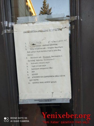 Yaxud, vergi ödəyiciləri üçün giriş qapısında vurulan elanlara diqqət yetirsəniz görərsiniz ki, onlar hamısı A4 formatında kağızlara “həkk olunaraq”, pəncərəyə skoçla yapışdırılıb. Bu da azmış kimi, şəkildən də göründüyü kimi, elanın da yarısı çap hərfləri, yarısı əllə yazılıb. Hansı ki, həmin elanları səliqəli, hətta elektron lövhələr formasında yerləşdirmək olardı.