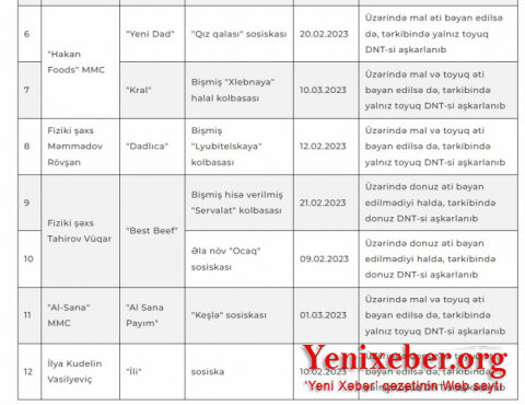 AQTA bildirir ki, nəzarət tədbirləri zamanı həmçinin, “Halal” adı ilə satışa çıxarılan kolbasa və sosiska məhsullarının analizi nəticəsində həmin məhsulların tərkibində donuz əti aşkarlanmayıb.