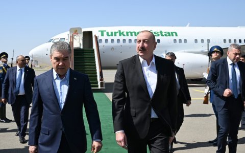 Qurbanqulu Berdiməhəmmədov Füzuli rayonuna gəlib, Prezident İlham Əliyev qarşılayıb