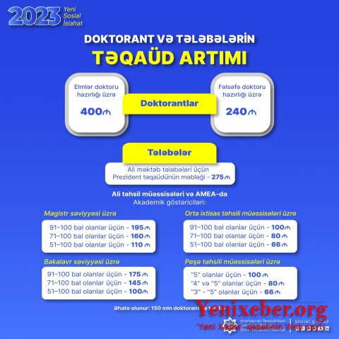 Согласно распоряжению президента Азербайджана Ильхама Алиева, увеличены стипендии 150 тыс. студентов и докторантов.