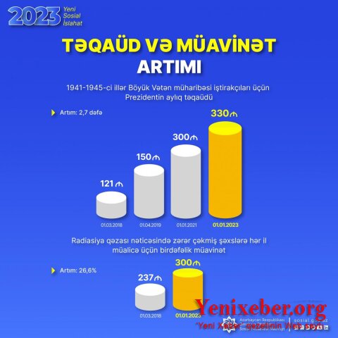 Как сообщает Yenixeber.org согласно распоряжению президента Ильхама Алиева, с 1 января 2023 года сумма ежемесячной пенсии президента Азербайджанской Республики участникам Великой Отечественной войны 1941-1945 годов, лицам, работавшим во время блокады города Ленинград в период Второй мировой войны на предприятиях, в учреждениях и организациях города и награжденным медалью "За оборону Ленинграда", нагрудным знаком "Житель блокадного Ленинграда", установлена в размере 330 манатов.