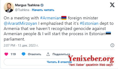 «На встрече с министром иностранных дел Армении Араратом Мирзояном я подчеркнул, что долг Эстонии перед Арменией заключается в том, что мы не признали геноцид армянского народа, и я начну этот процесс в парламенте Эстонии», - заявил Цахкна в соцсети X.