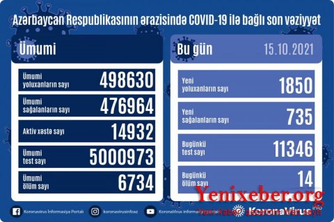 В Азербайджане выявлено еще 1850 случаев заражения коронавирусом, 735 человек вылечились.
