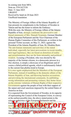 İran hökuməti İsveçin Tehrandakı səfirliyinə ünvanladığı məktubda Almaniyanın Avropa Parlamentindəki (AP) nümayəndəsi Hanna Nyumanın İranda insan haqlarının pozulması ilə bağlı tənqidlərinə son qoyulmasını tələb edib. Xanım Nyuman öz Tvittert hesabında bu məktubun mətnini paylaşıb.
