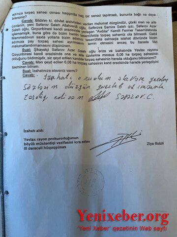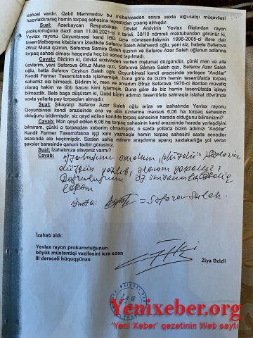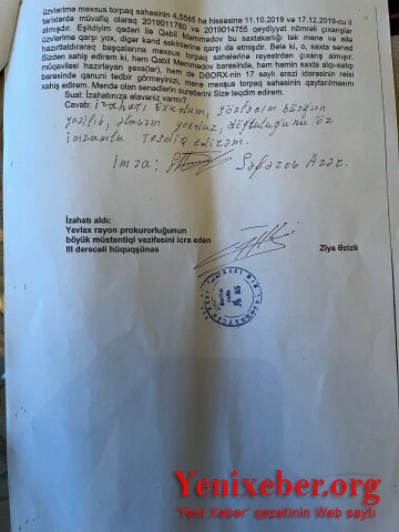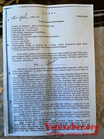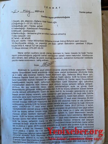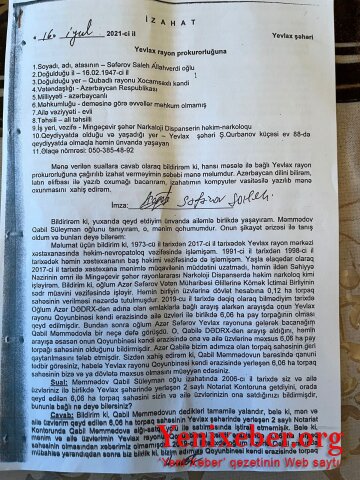 İlk olaraq bildirmək istəyirəm ki, Səfərov Azər Saleh oğlu mənim xalam oğludur və iki ailə arasında olan mülki mübahisəsiyə məhkəmələr tərəfindən baxılaraq hüquqi qiymət verilməkdədir.