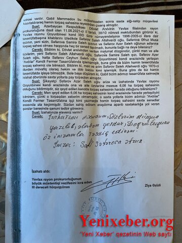 Azər Səfərov tərəfindən Qabil Məmmədova qarşı iddia qaldırılmış və KFT-nin mülkiyyətində və istifadəsində olan torpaq sahəsindən təqribən 6 hektar torpaq sahəsinin onlara məxsus olması iddia edilmişdir. KFT tərəfindən aidiyyəti orqanlara sorğu verildikdən sonra məlum olmuşdur ki, 1998-ci ildə həmin torpaq sahəsindən 6.06 ha torpaq sahəsi “Avdılar” Kəndli Fermer Təsərrüfatına məlum olmadan Səfərov Saleh Allahverdi oğlu, Səfərov Azər Saleh oğlu, Səfərov Ceyhun Saleh oğlu, Səfərova Xatirə Musa qızı və Səfərova Samirə Saleh qızının adına rəsmiləşdirilmişdir. Bundan sonra KFT tərəfindən Yevlax Aqrar İslahat Komissiyasının bu barədə qərarı və Azər Səfərov, onun ailə üzvlərinin adına verilmiş dövlət aktı Şəki İnzibati Məhkəməsində mübahisələndirilmişdir. KFT-nin iddiası 1-ci instansiya məhkəməsi tərəfindən qismən təmin edilmişdir. Qərardan narazı qalan Azər Səfərov artıq apelyasiya şikayəti verilmişdir. İşə avqust ayında baxılacaqdır. KFT-nin qanuni mülkiyyətində olan torpaq sahəsini hansısa məlum olmayan, ortaya çıxarılmayan qərar əsasında qanunsuz yollarla ələ keçirən Azər Səfərov və onun ailə üzvləri atam Qabil Məmmədovun 41 nəfərə məxsus, o cümlədən də, dövlət torpaqlarını aqrar islahatlardan gizlədərək saxta yollarla özgəninkiləşdirdiyini qeyd etmişdir. Çox maraqlıdır ki, böhtan xarakteri daşıyan bu məlumat Azər Səfərov tərəfindən hansı sübutlarla təsdiq edilir?! Və yaxud sual olunur ki, Azər Səfərov 6 hektar torpaq sahəsinə hansı əsaslarla iddia edir, keçmiş kolxoz torpaqlarının mülkiyyətçisi ola bilərdimi!? Axı qanunvericilik kolxoz, sovxoz torpaqlarının mülkiyyətçisi ola bilən əhali kateqoriyasını müəyyən edib, onlar bu kateqoriyadan hansına aiddirlər?! Əlbəttə, heç birinə. Xüsusilə vurğulamaq istərdim ki, Azər Səfərov və iş üzrə digər cavabdehlər onalra torpaq sahəsi ayrılması barədə qərarı belə ortaya çıxara bilmədilər. Göründüyü kimi məhz elə Azər Səfərovun özünün və ailə üzvlərinin iddiası tamamilə qanunsuzdur. Sadəcə qanuni əsaslarla məhkəmədə əleyhinə qərar çıxarıldığından məqsədi ara qarışdırmaq olan Azər Səfərov bununla bizi və məhkəmələri qorxutmaq istəyir.
