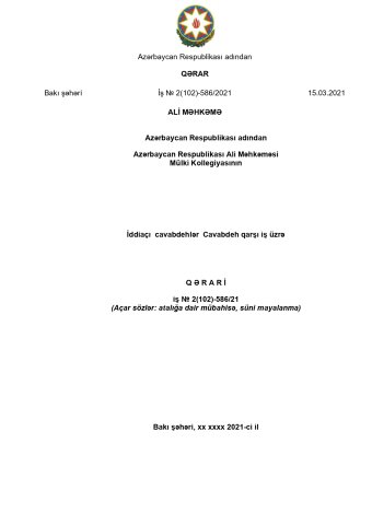 İşin təfərrüatları Ali Məhkəmənin Mülki Kollegiyasının 2(102)-586/2021 saylı iş üzrə 15 mart 2021-ci il tarixli Qərarında əks olunub.