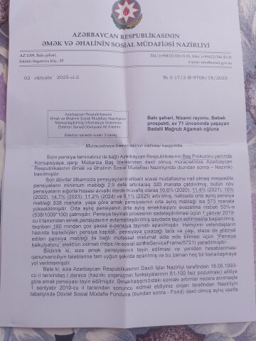 Yenixeber.org: İllərdir pensiya , sosial təminat hüququ ilə bağlı iki qurumun – son xidmət yerim olan DİN Daxili Qoşunları ilə ƏƏSMN-in özbaşınalığı arasında yaşam uğrunda savaşdayam. DİN Maliyyə Plan İdarəsi “Hərbi qulluqçuların pensiya təminatı haqqında” qanunun 15v , 23b maddələrinə əsasən, uyğun olaraq minimum pensiyanın 300 və 100 faizi həcmində pensiyaya əlavəni, 58-ci maddə əsasında dolanışıq xərcləri indeksinin dəyişməsi ilə bağlı pensiyamı yenidən hesablamayıb; 47 ilin zabitinin 1991-ci ildən Azərbaycan Silahlı Qüvvələrində zabit rütbəsində xidmətdə olmadığını “əsas” tutub, 390 manatlıq mülki vəzifə maaşı yazıb; ƏƏSMN tabeliyində DSMF ( Xüsusi Şərtlərlə Təyinat üzrə Mərkəzi Filialı) pensiyam Fonda keçəndən sonra “Əmək pensiyaları haqqında” qanunun 26.1 maddəsinə qarşı çıxaraq, DİN-də təyin edilən pensiyanı 45.10 manat azaldıb, 19.1.4-cü maddəyə əsasən, 1-ci dərəcəli əlilə qulluğa görə 11 manat (2019-cu ildən ləğv edilib, Prezident təqaüdü kimi əlilə qulluq edən şəxsə ödənilir və hazırda 120 manatdır) , 1-ci dərəcəli Qarabağ əlilinin pensiyasına 110 manat əlavəni hesablamaqdan imtina edib. 1 saylı Bakı İnzibati-İqtisadi Məhkəməsi (hakim Elçin Məmmədov) 05.07.2017-ci il tarixli 2-1(81)-1889/17 saylı qərarla pensiyama 110 manat əlavənin hesablanmalı olmasını qərara alıb və qərar 2023-cü ilin aprelinə kimi icra olunub.