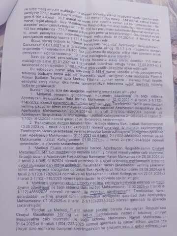 Pensiyama qanunvericiliklə nəzərdə tutulan əlavələrin verilməməsindən şikayətlərimə cavab olaraq Xüsusi Şərtlərlə Təyinat üzrə Mərkəzi Filialın (XŞTMF) direktoru Şahin Əliyev 26.01.2023 tarixli, onun müavini Elnur Qurbanov 22.02.2023 tarixli eyni məzmunlu məktublarla pensiyamın məhkəmə qərarı ilə əlavə olunan 110 manatla birlikdə 1112.44 manat hesablandığını, 30 gün müddətində məhkəməyə müraciət etmək hüququmu bildiriblər. 25.02.2023-cü ildə Bakı İnzibati Məhkəməsinə iddia təqdim edilib və martda icraata götürülüb. Məhkəmə (hakim Bəhlul Cəlalov) mayın 2-ə hazırlıq iclası təyin edəndə, apreldən pensiyama məhkəmə qərarı ilə əlavə olunan 110 manatı kəsməklə yenidən 138.79 manat azaldıb 973.65 manata salıblar. Hakim bu özbaşınalığa SONRA qiymət verəcəyini deyib və pensiya təyin olunandan sonra işləməyimə görə pensiyamın yığılan kapitala uyğun yenidən hesablanmalı olmasını da tələbə əlavə etməyimə HÜQUQİ YARDIM edib. Lakin SONRA mən xəstəxanada yatanda nə HÜQUQİ YARDIM yada düşüb, nə dövlət hesabına vəkillə təminatım, nə də xəstəxanadan iclasın ertələnməsi barədə müraciətim. Cavabdeh PENSİYA FİLİALININ prosessual hüquq fəaliyyəti qabiliyyəti olmayan “nümayəndəsi” MƏHKƏMƏ FİLİALI- 39 SAYLI VƏKİL BÜROSU 01.04.2023-cü ildə “LƏĞV ETDİYİ” 05.07.2017-ci il tarixli Qərarın QÜVVƏDƏ OLDUĞUNU sübut kimi təqdim edib və iddianı mümkün saydırmayıb. Özbaşınalığa baxın, XŞTMF rəsmi məktublarla məhkəmə qaydasında hüququmu təmin etməyi bildirir, məhkəməyə müraciət edəndə isə pensiyamı daha da azaldır. Belədə deyiblər, yumurtlamadı-yumurtlamadı, falı da yedi?