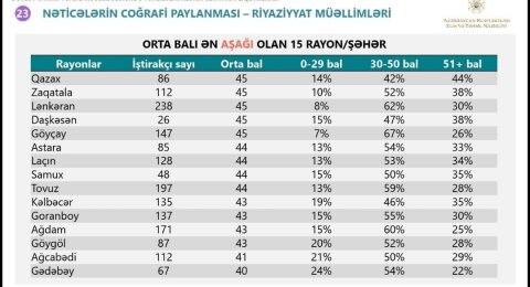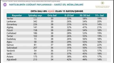 "Siyahı üzrə ilk sırada Azərbaycan dili və ədəbiyyat fənni üzrə Tərtər, Bərdə, Daşkəsən (hər üçü 14%), riyaziyyat fənnindən Gədəbəy (24%), Göygöl (20%), Ağcabədi (21%), xarici dil fənni üzrə isə Ağcabədi (42%), Astara (38%), Lerik rayonundan (37) olan müəllimlər olub".