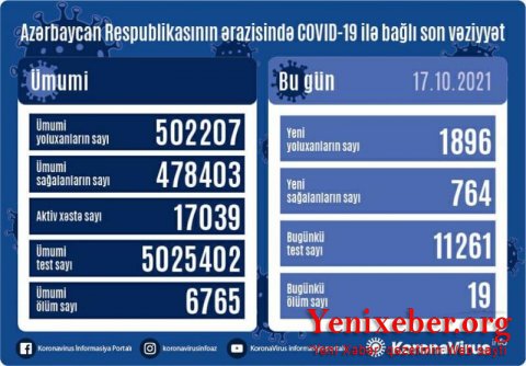 Nazirlər Kabineti yanında Operativ Qərargahdan Yenixeber.org-a verilən məlumata görə, analiz nümunələri müsbət çıxan 19 nəfər vəfat edib.
