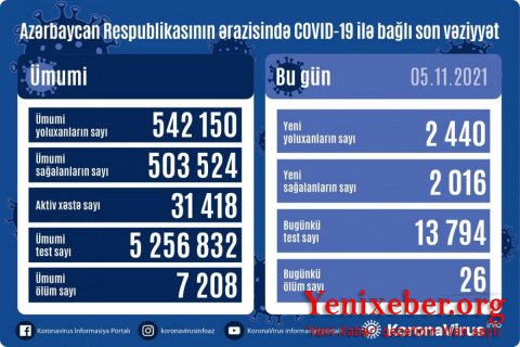Yenixeber.org: Nazirlər Kabineti yanında Operativ Qərargahdan verilən məlumata görə, analiz nümunələri müsbət çıxan 26 nəfər vəfat edib.