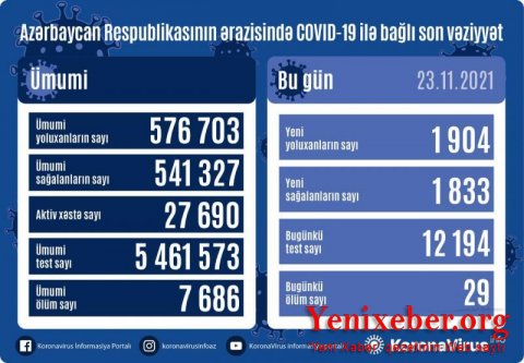 Yenixeber.org: Nazirlər Kabineti yanında Operativ Qərargahdan verilən məlumata görə, analiz nümunələri müsbət çıxan 29 nəfər vəfat edib.