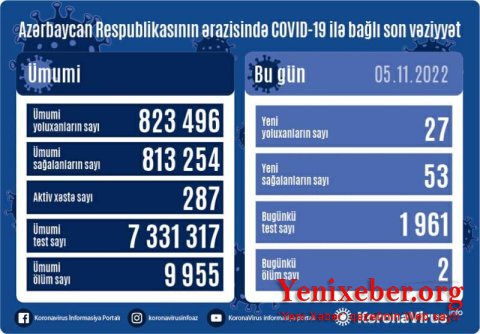 Son sutkada 27 nəfər koronavirusa yoluxub -2 nəfər ölüb