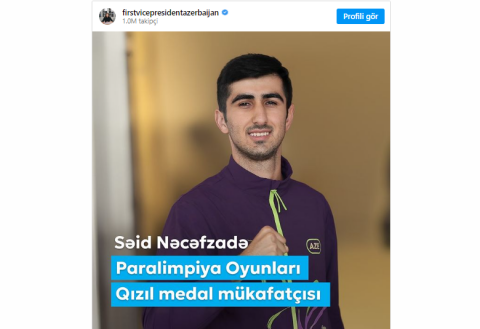 Azərbaycanın Birinci vitse-prezidenti Mehriban Əliyeva paralimpiya çempionu olan Səid Nəcəfzadəni təbrik edib.