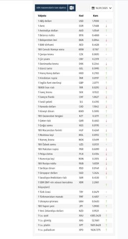 Yenixeber.org-un məlumatına görə, 2025-ci il yanvarın 16-da ABŞ dollarının məzənnəsi dəyişməyərək 1,7000 manat, Türkiyə lirəsi 0,0479 manat təşkil edib.