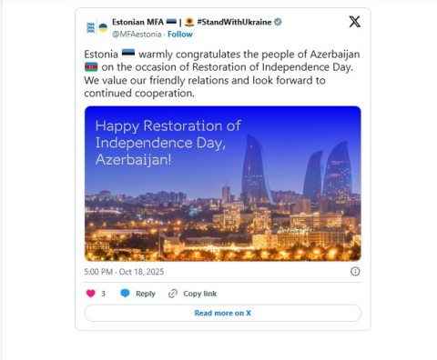 Estoniya Xarici İşlər Nazirliyi "X" sosial hesabında Azərbaycan xalqını Müstəqilliyin Bərpası Günü münasibətilə təbrik edib.