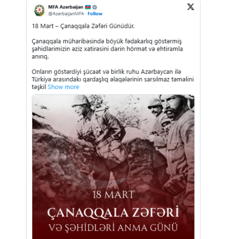 Azərbaycan Xarici İşlər Nazirliyinin (XİN) "X" hesabında Çanaqqala şəhidlərinə dair paylaşım edilib.