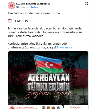 Türkiyənin Milli Müdafiə Nazirliyinin "X" sosial media hesabında 31 Mart – Azərbaycanlıların Soyqırımı Günü ilə bağlı paylaşım edilib.
